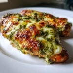 Now for the fun part! Take about 2 tablespoons of pesto per chicken breast and spread it evenly over the top. I like to use the back of a spoon to really coat every inch – this is what gives every bite that amazing herbaceous flavor. Then pile on that mozzarella! Use your fingers to gently press the cheese into the pesto so it sticks and creates an even layer. Pro tip: if you’ve got uneven chicken breasts, just tuck a little extra cheese into the thinner spots to prevent drying out.